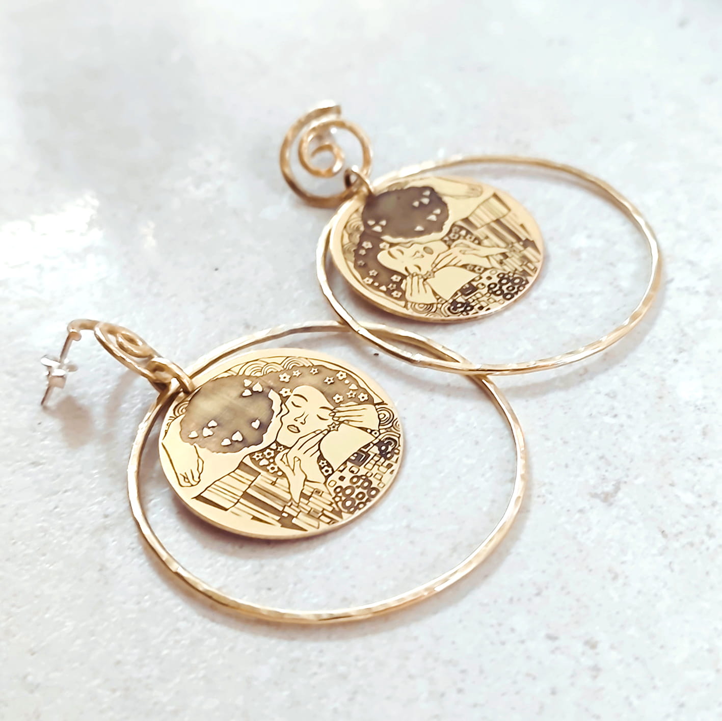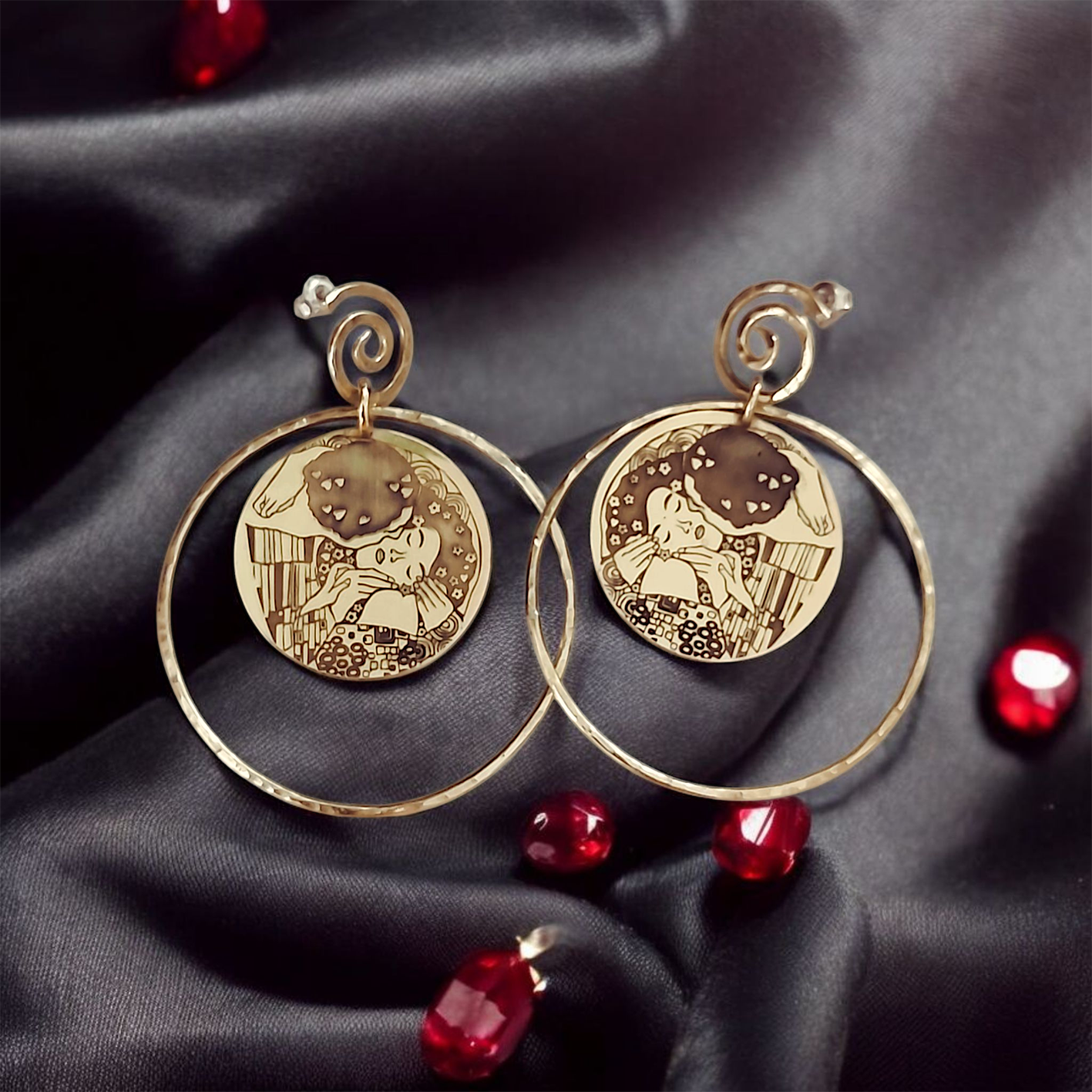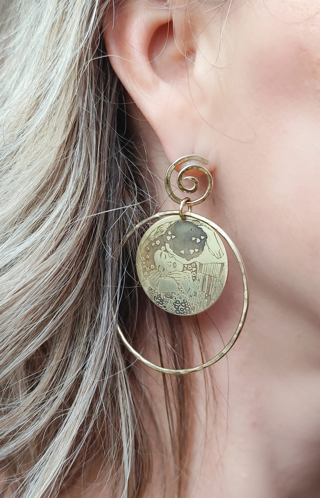Kiss - Gustav Klimt, duże kolczyki okrągłe, wiszące, sztyft