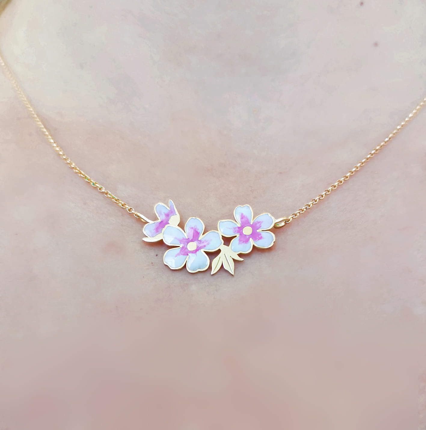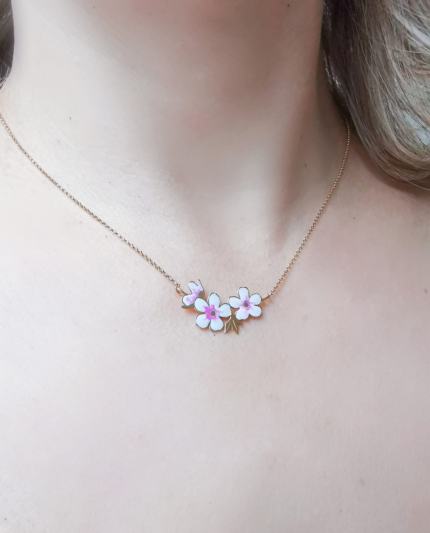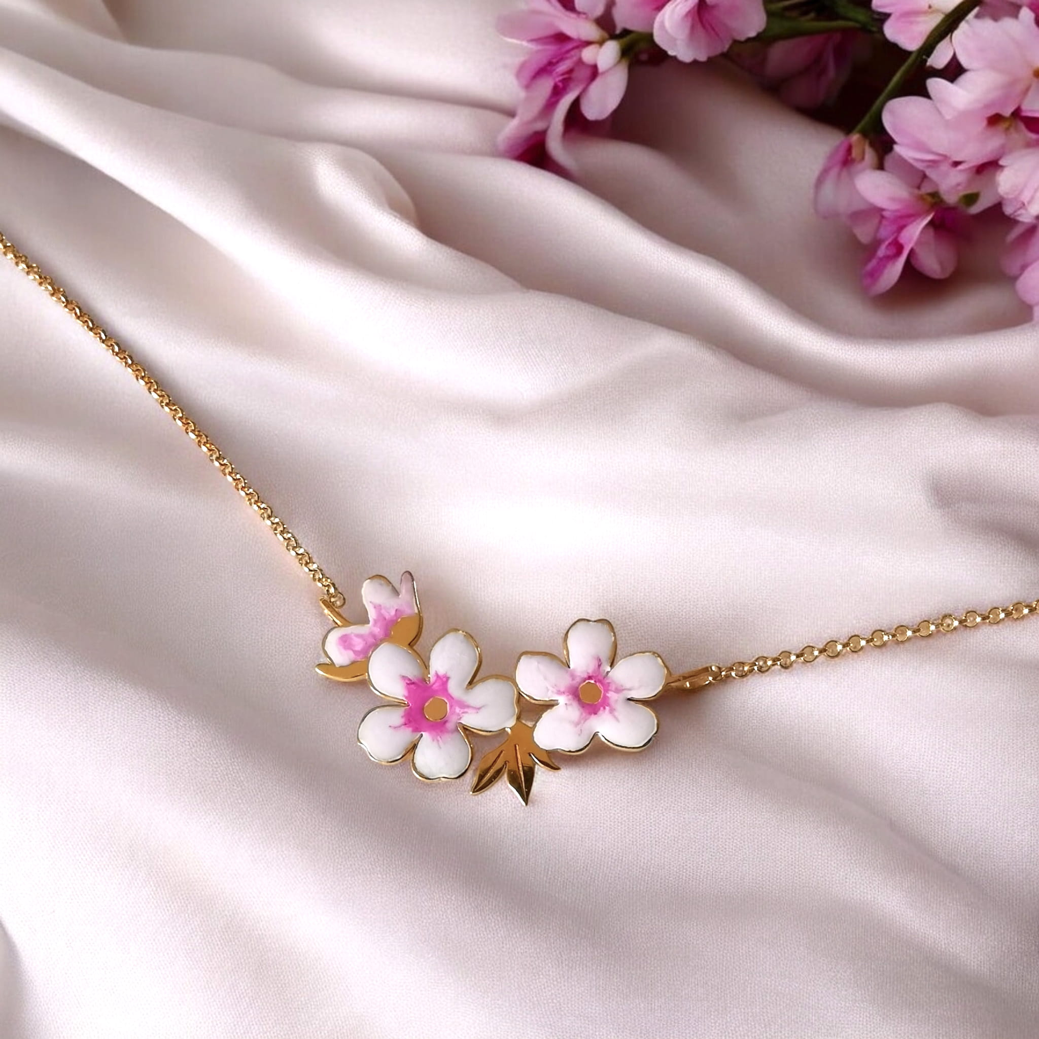 - naszyjnika srebrnego z emaliowanymi kwiatami wiśni. Długość elementu z kwiatami ok 35mm.