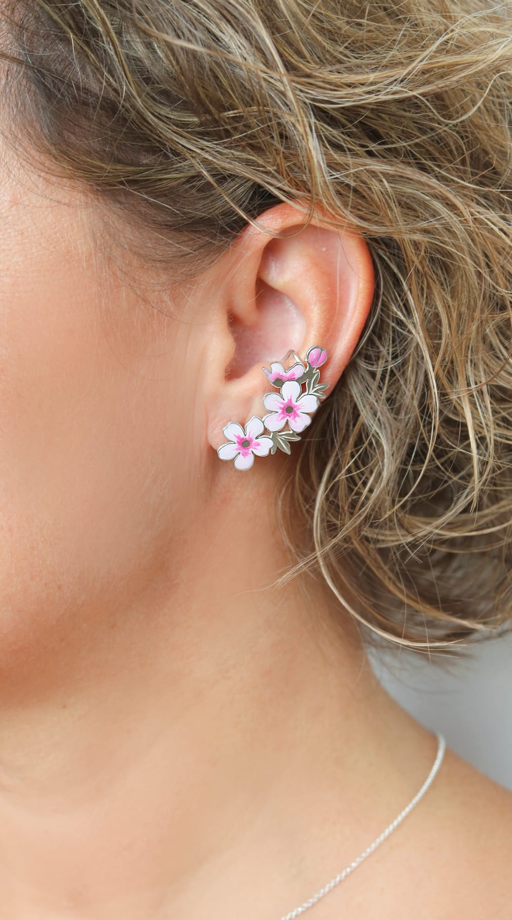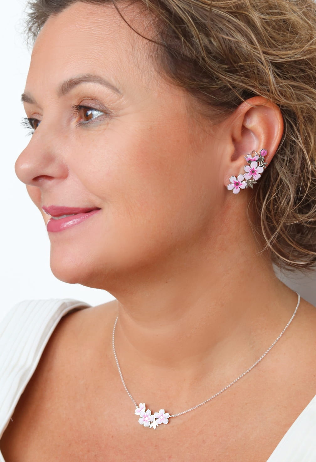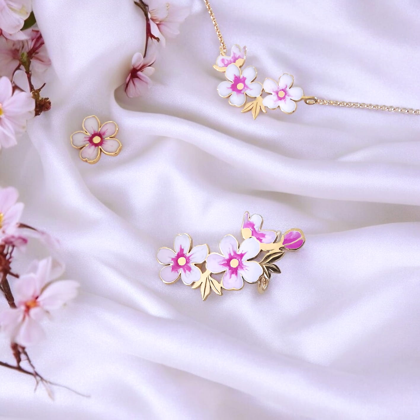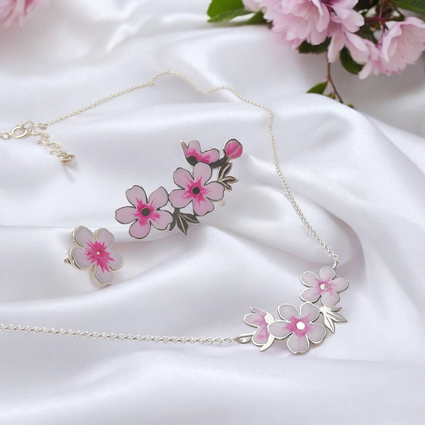 Komplet-Naszyjnik z kwiatami wiśni i nausznica z kolczykiem, srebro, emalia