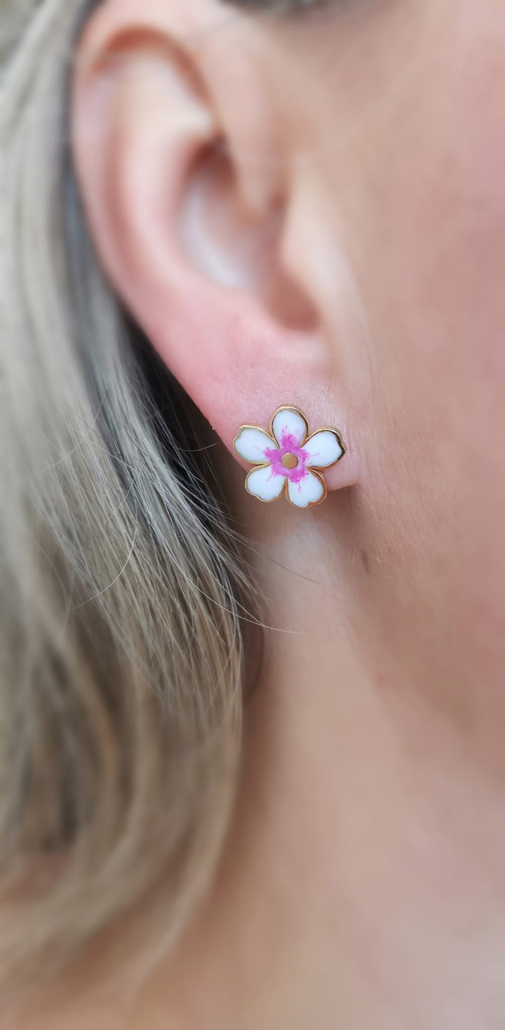 - nausznicy zapinanej na sztyft plus 1 mały kwiat wiśni do drugiego ucha.