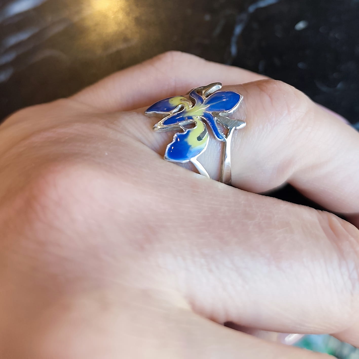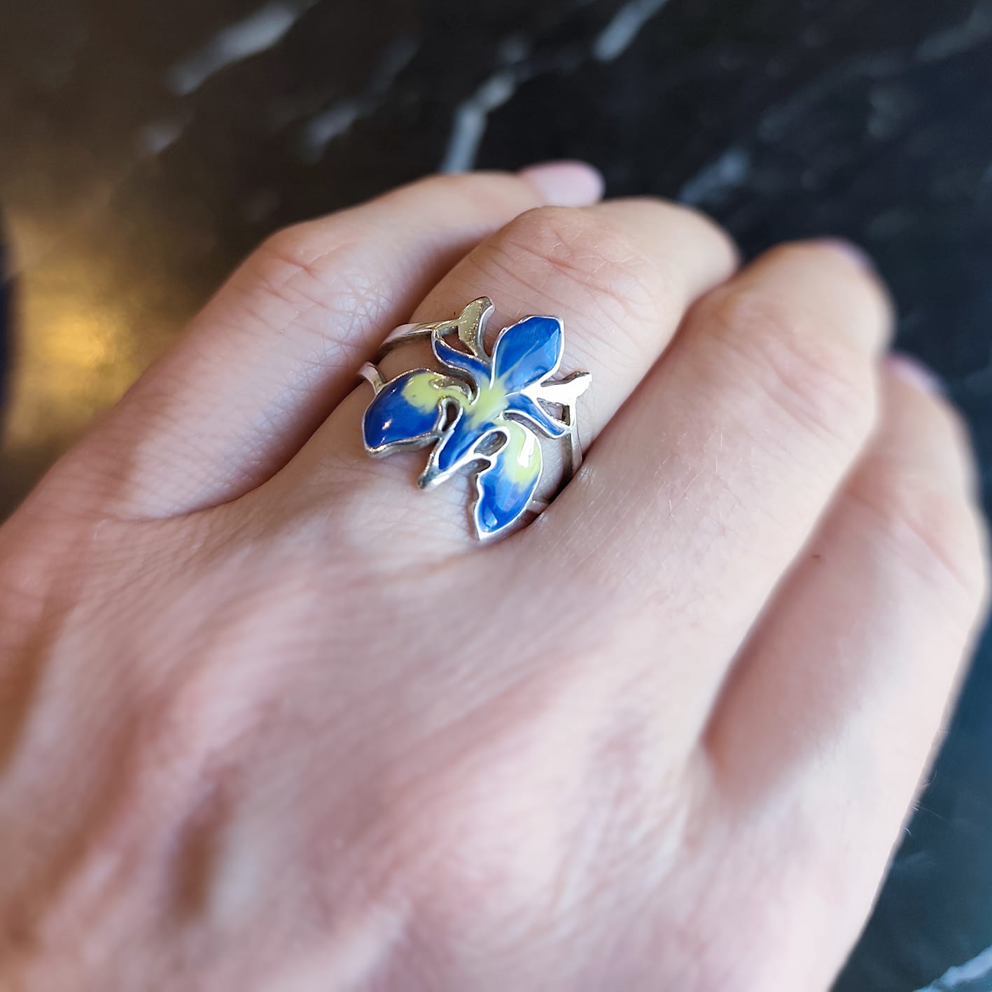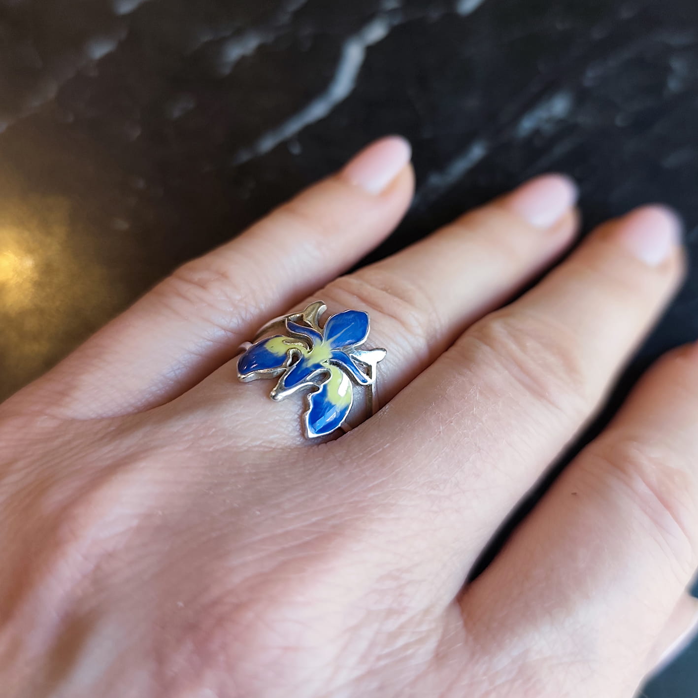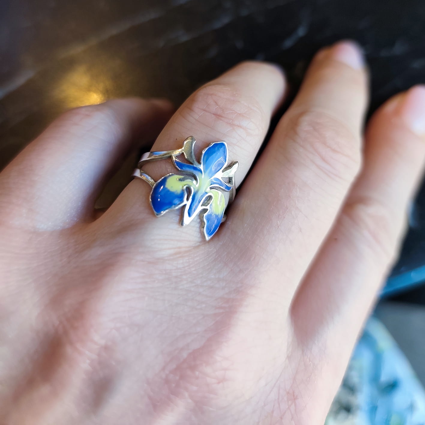 Irysy kocham i podziwiam co roku w ogrodzie botanicznym w Krakowie. Występują niemal w każdym kolorze, natomiast ten srebrny pierścionek z irysem wykonałam w wersji fioletowo/niebiesko - żółtej, jest chyba najbardziej charakterystyczna dla irysów.