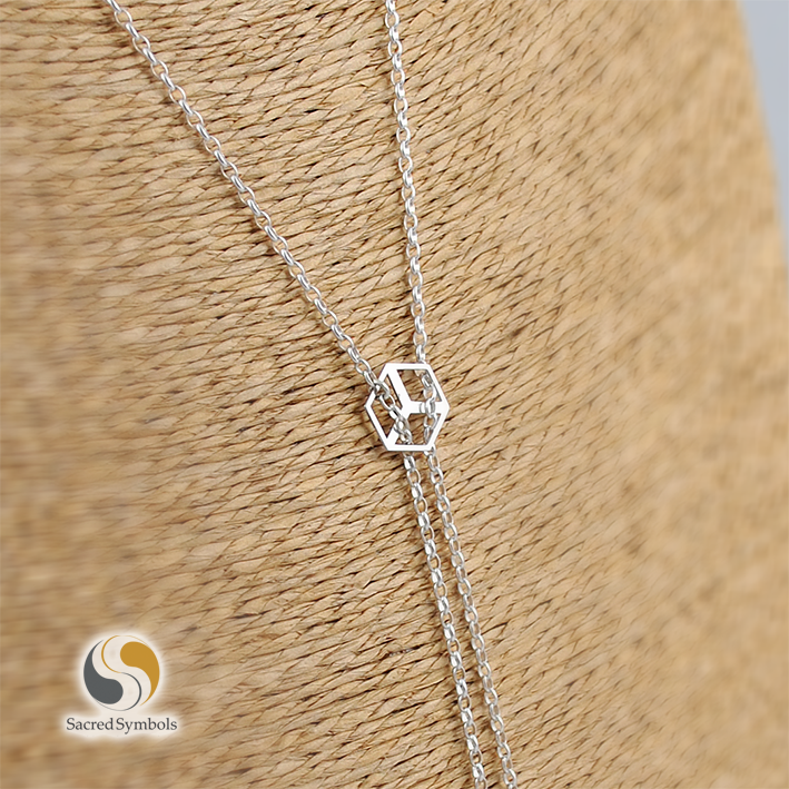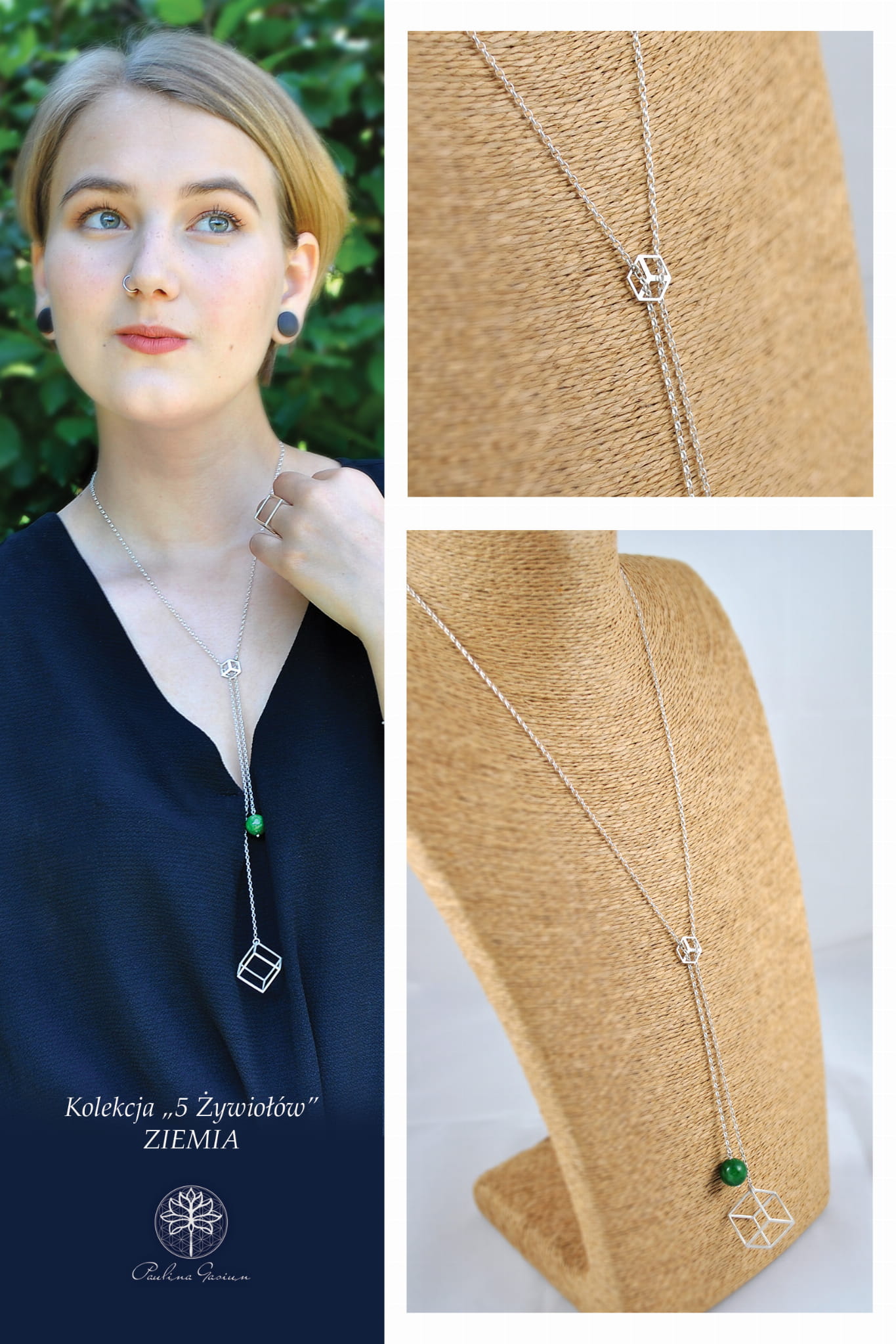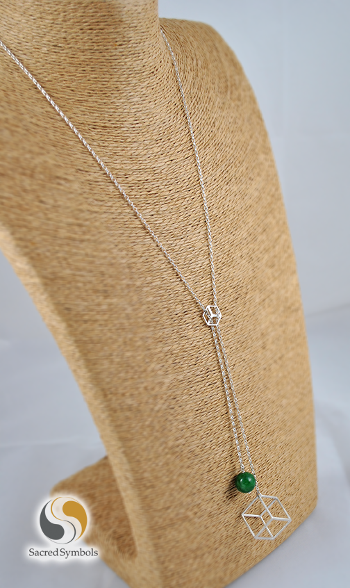 Naszyjnik z trójwymiarową bryłą sześcianu, symbolizującego żywioł Ziemi. Naszyjnik wykonany jest w formie "krawatki" - wkładany przez głowę, z możliwością regulacji długości aż do wysokości poniżej mostka, czyli pełna długość razem z łańcuszkiem to ponad 80 cm. Bryłę równoważy minerał w formie 12 mm kulki. Jest to w tym przypadku awenturyn, może być też jadeit zielony.