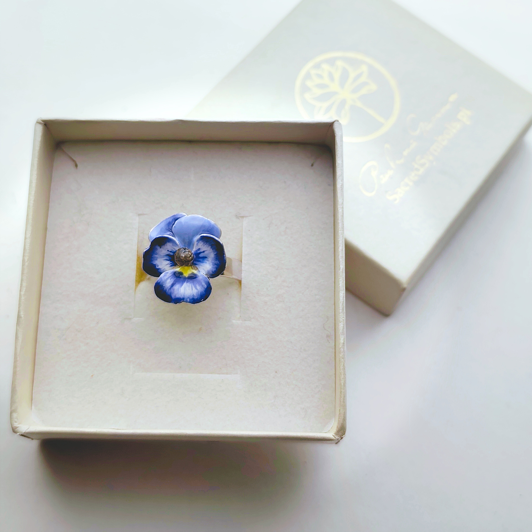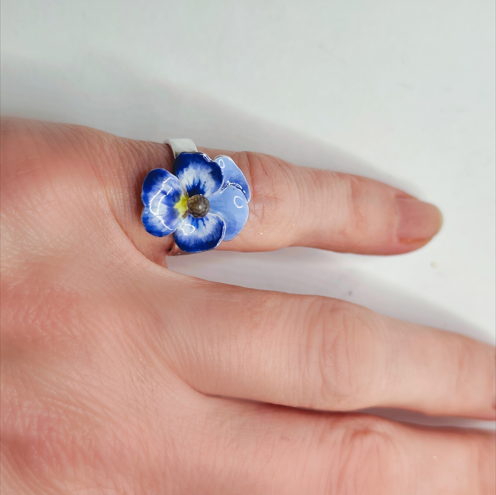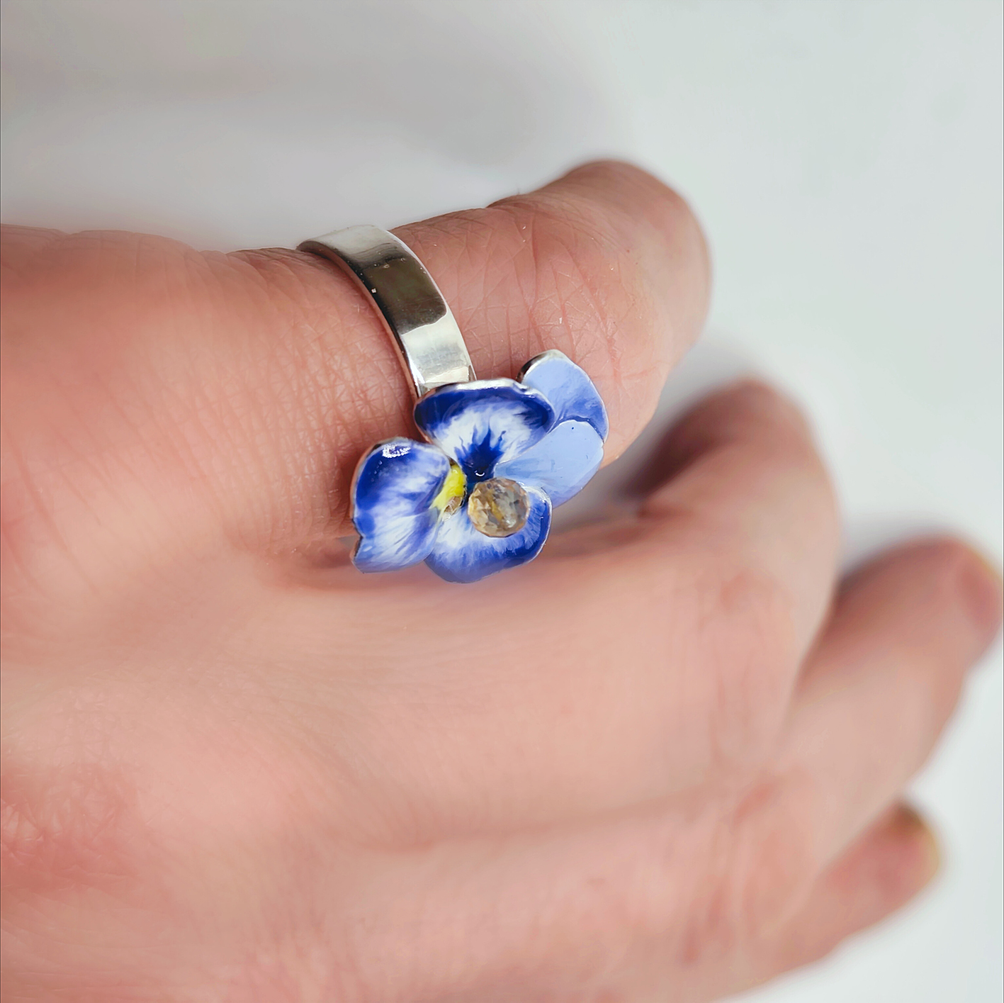 Przestrzenny pierścionek z bratkiem, w którym kwiat składa się z 2 elementów, tworząc przestrzenną formę. Niezwykle subtelny i kobiecy, wykonany ręcznie i malowany emalią żywiczną w odcieniach błękitów i bieli.