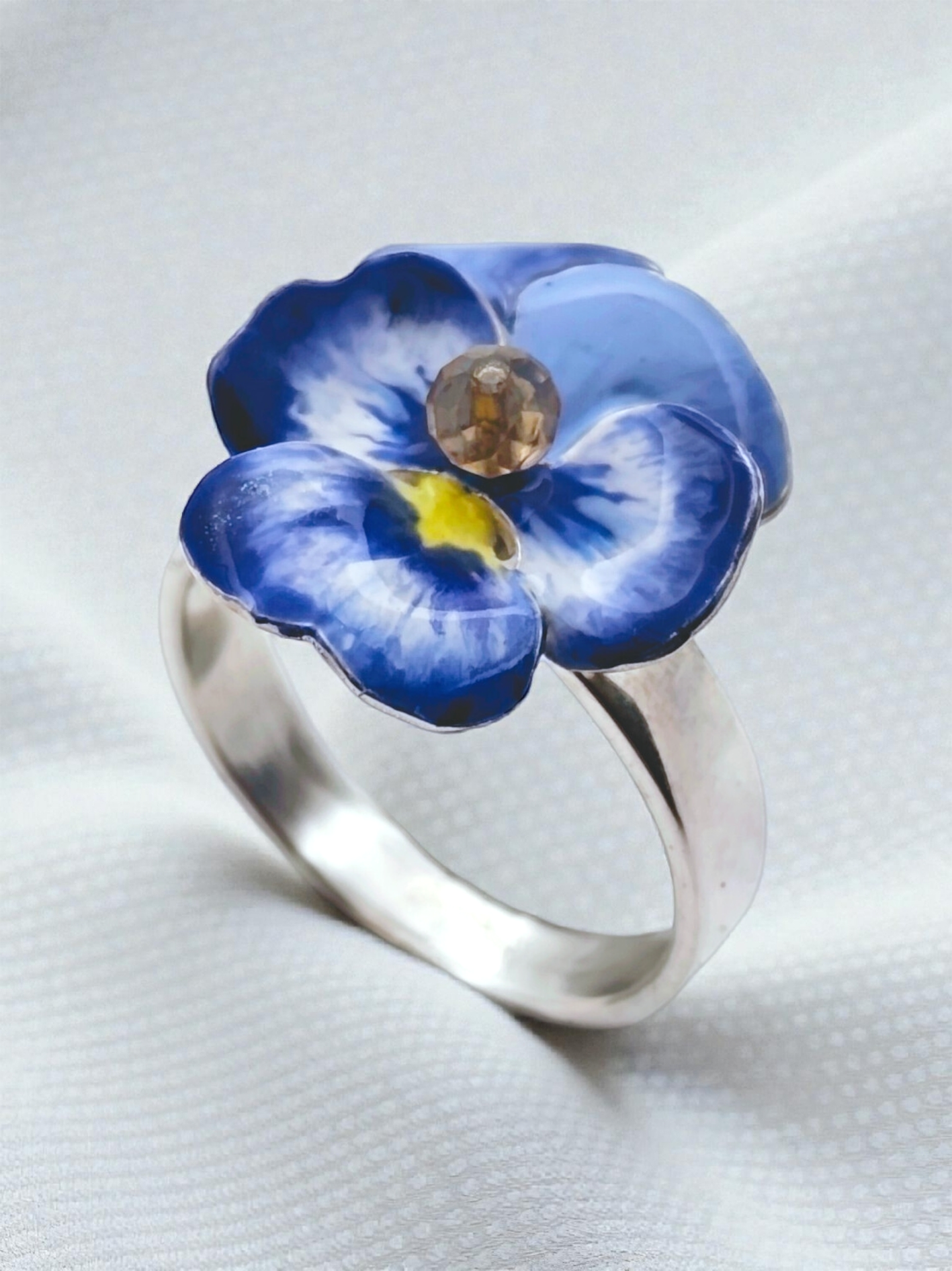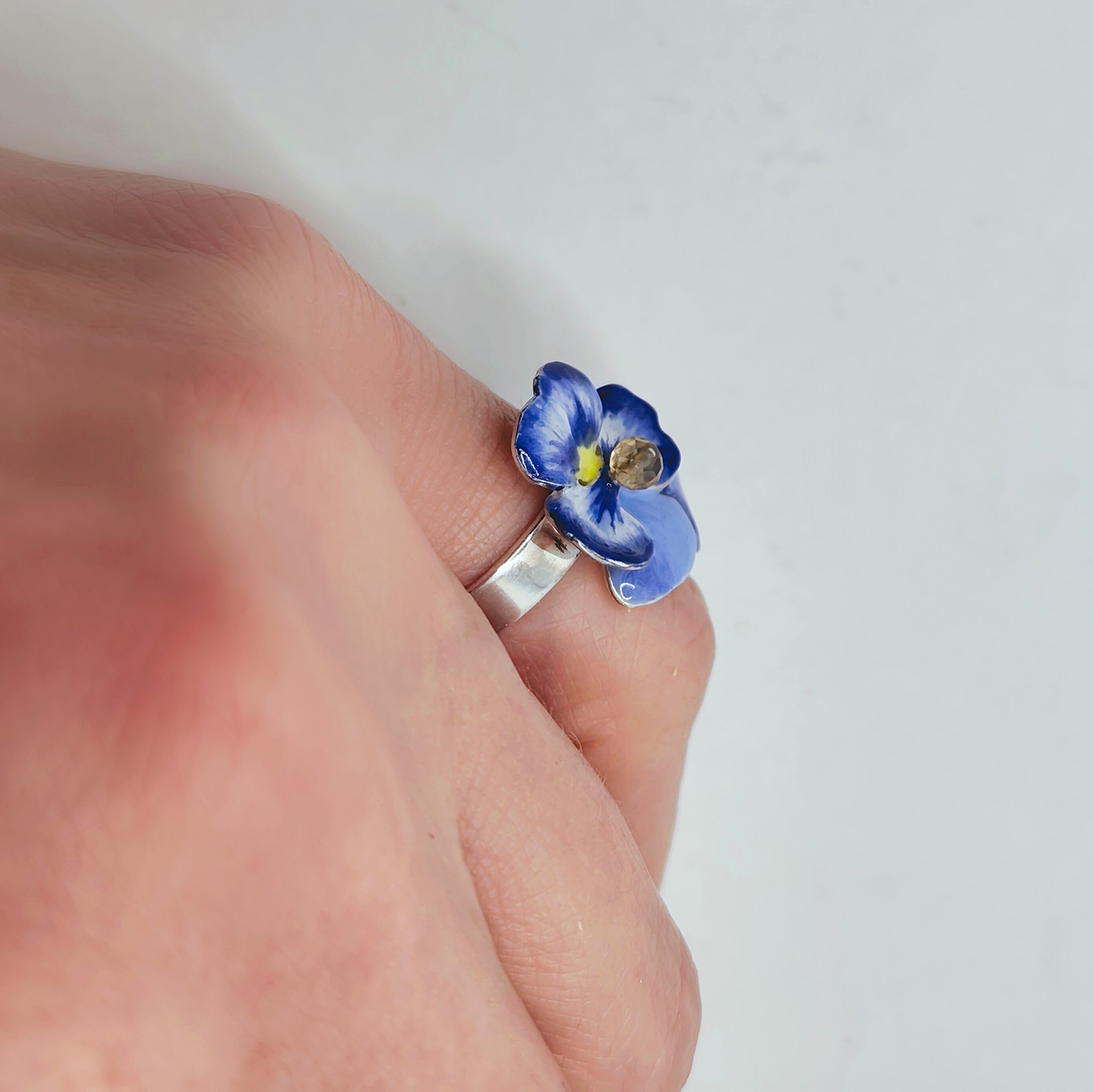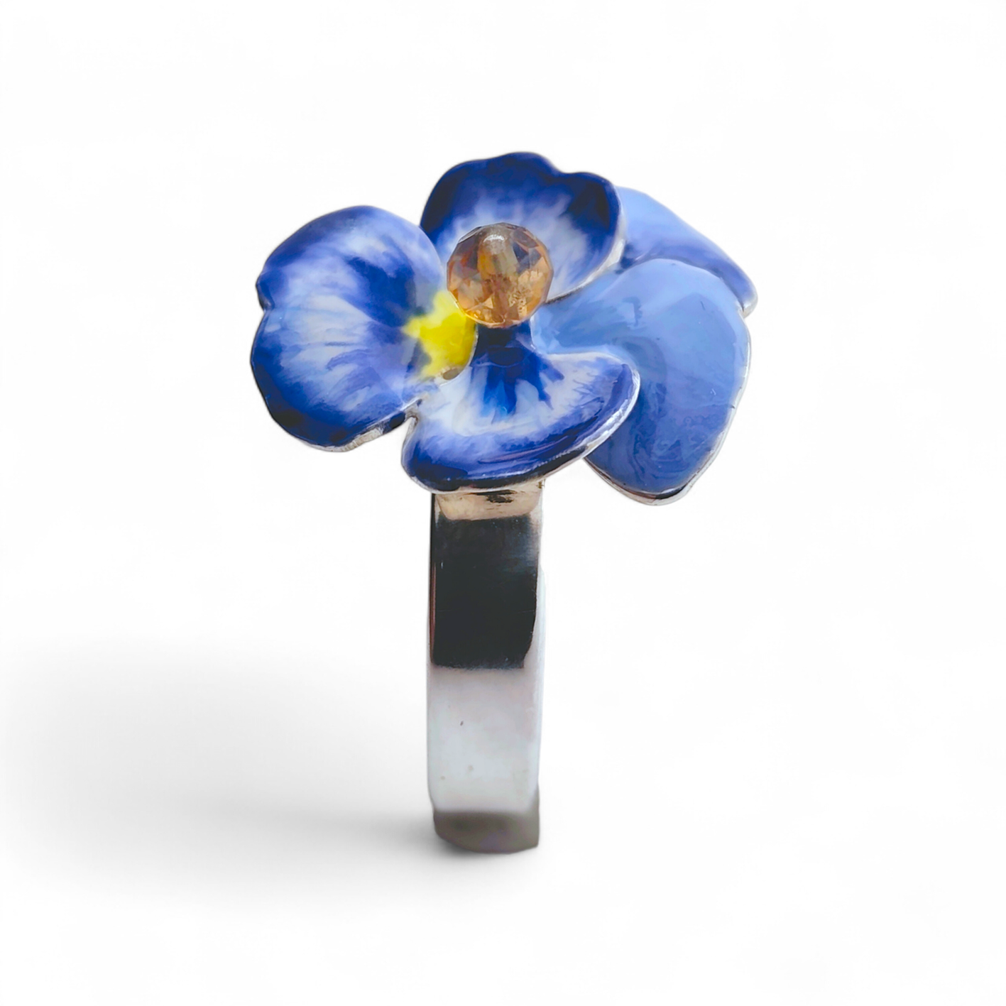 Przestrzenny pierścionek z bratkiem, w którym kwiat składa się z 2 elementów, tworząc przestrzenną formę. Niezwykle subtelny i kobiecy, wykonany ręcznie i malowany emalią żywiczną w odcieniach błękitów i bieli.