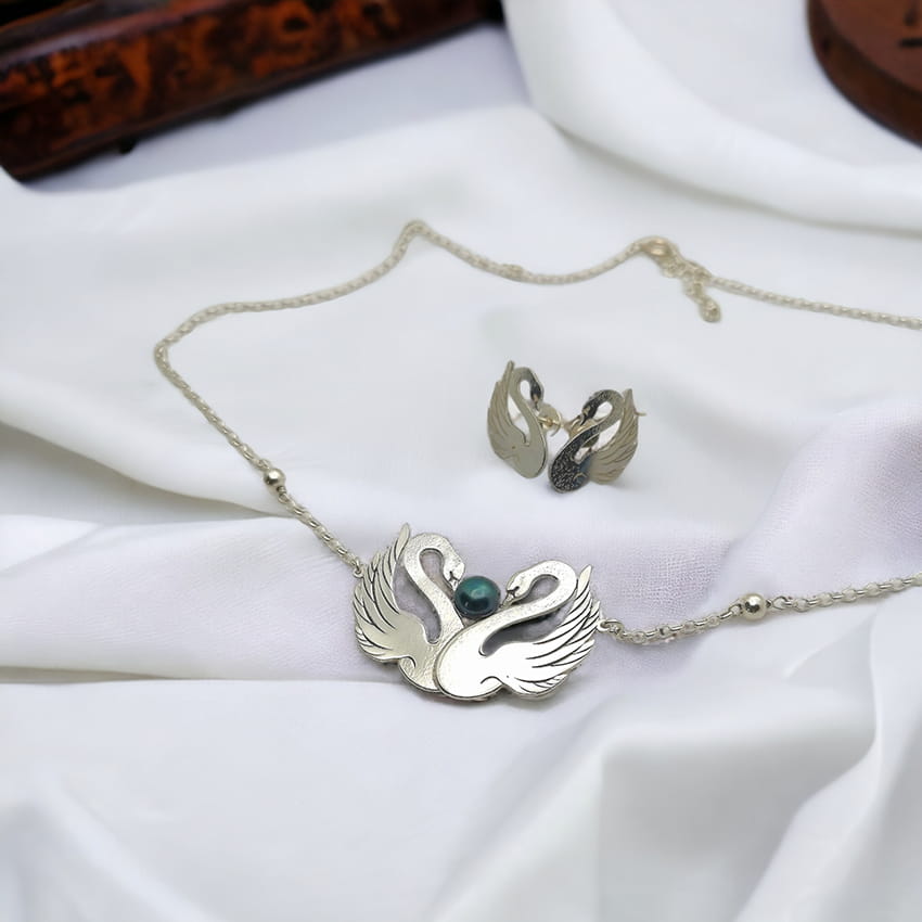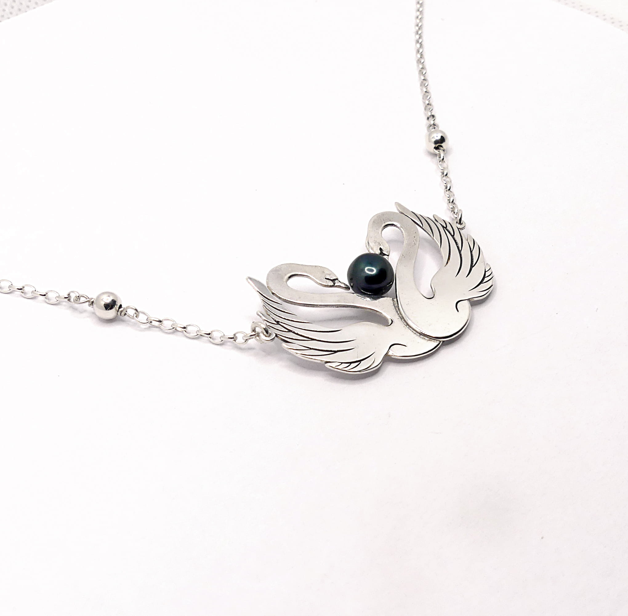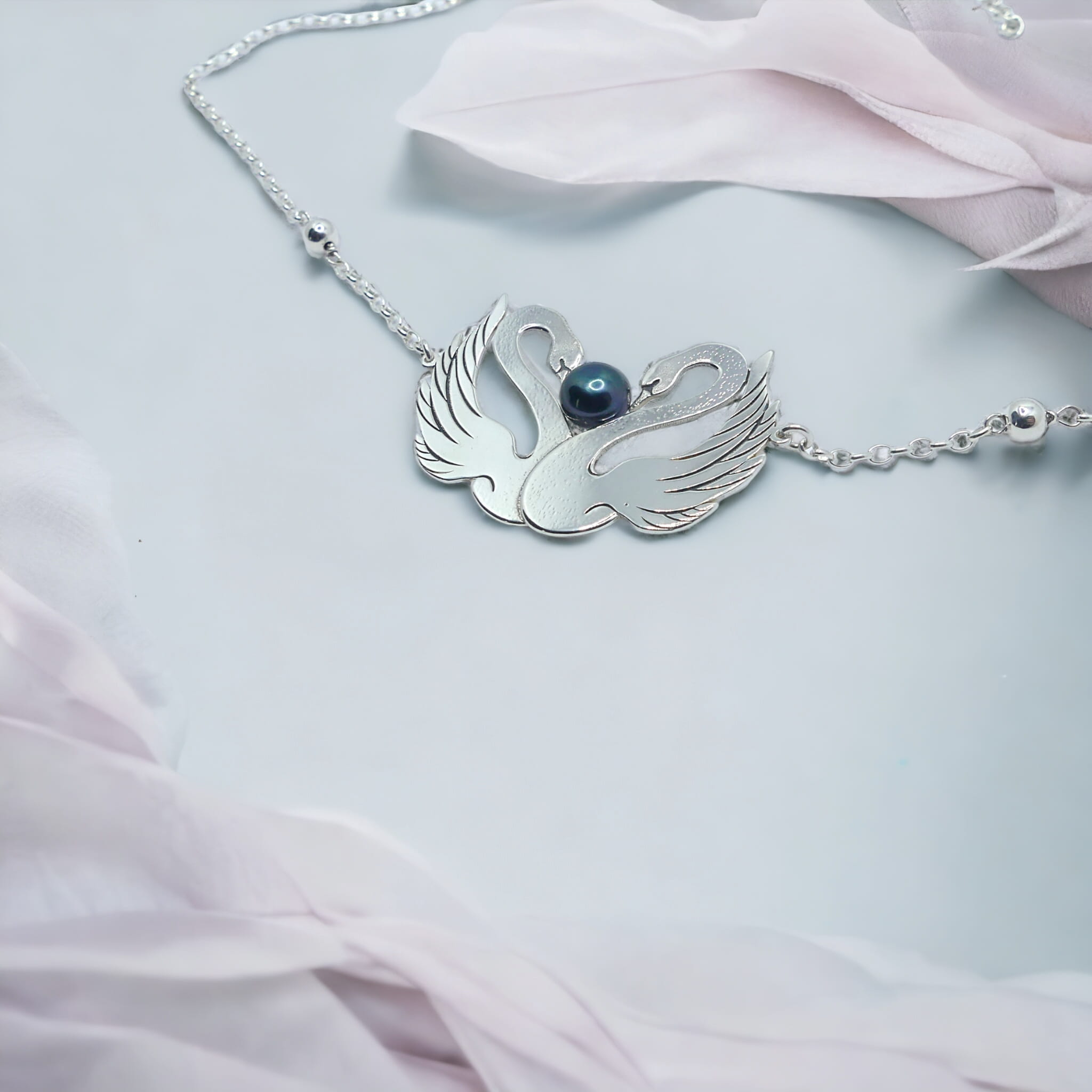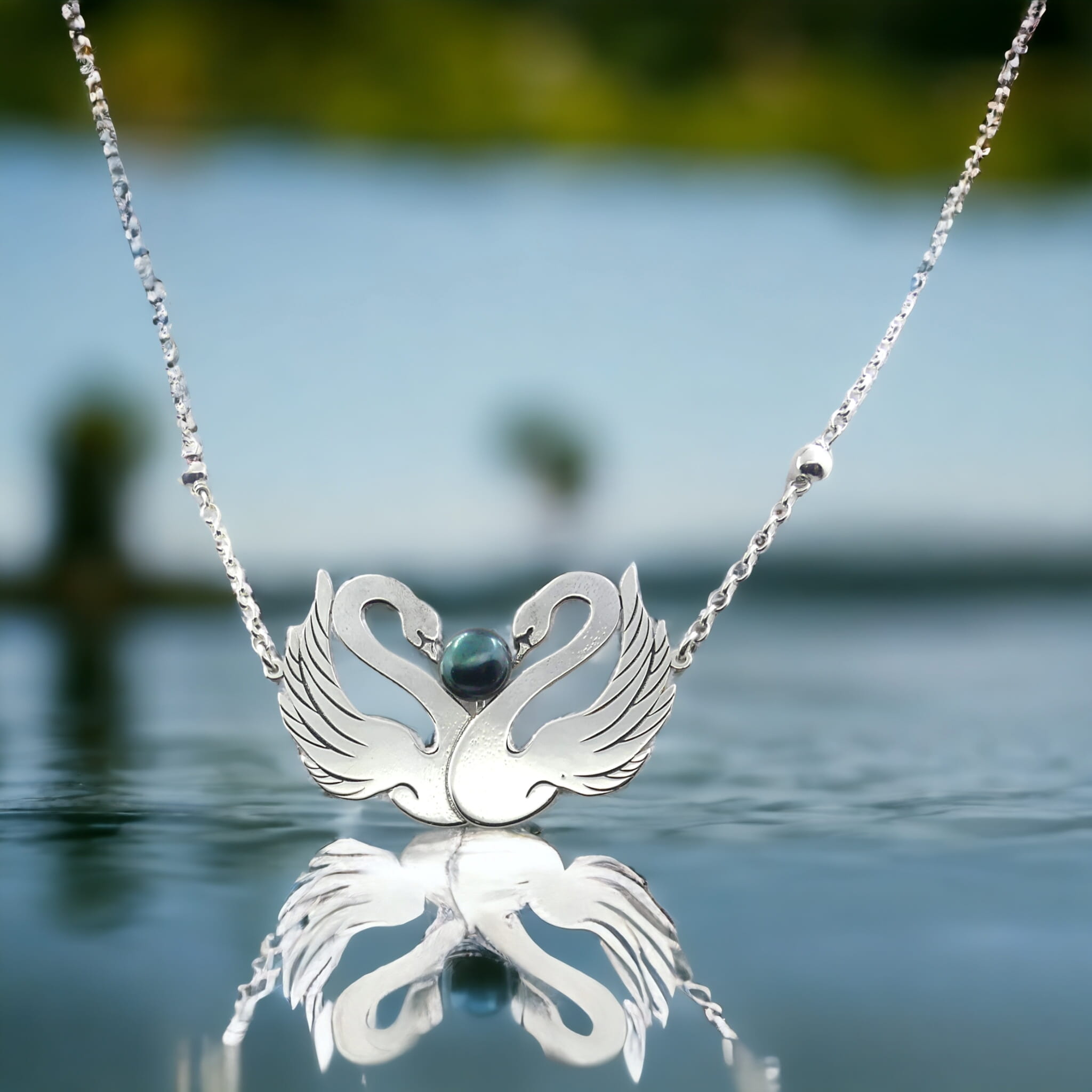 Białe Łabędzie z czarną perłą - unikatowy, srebrny naszyjnik, symbolizujący Miłość, spełnioną relację, w której oboje partnerów dbają o swój cenny Skarb (czarna perła) - połączenie serc i dusz.