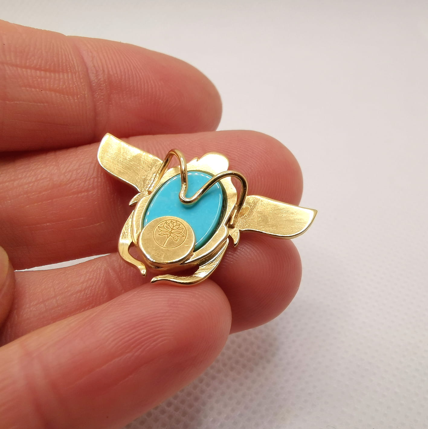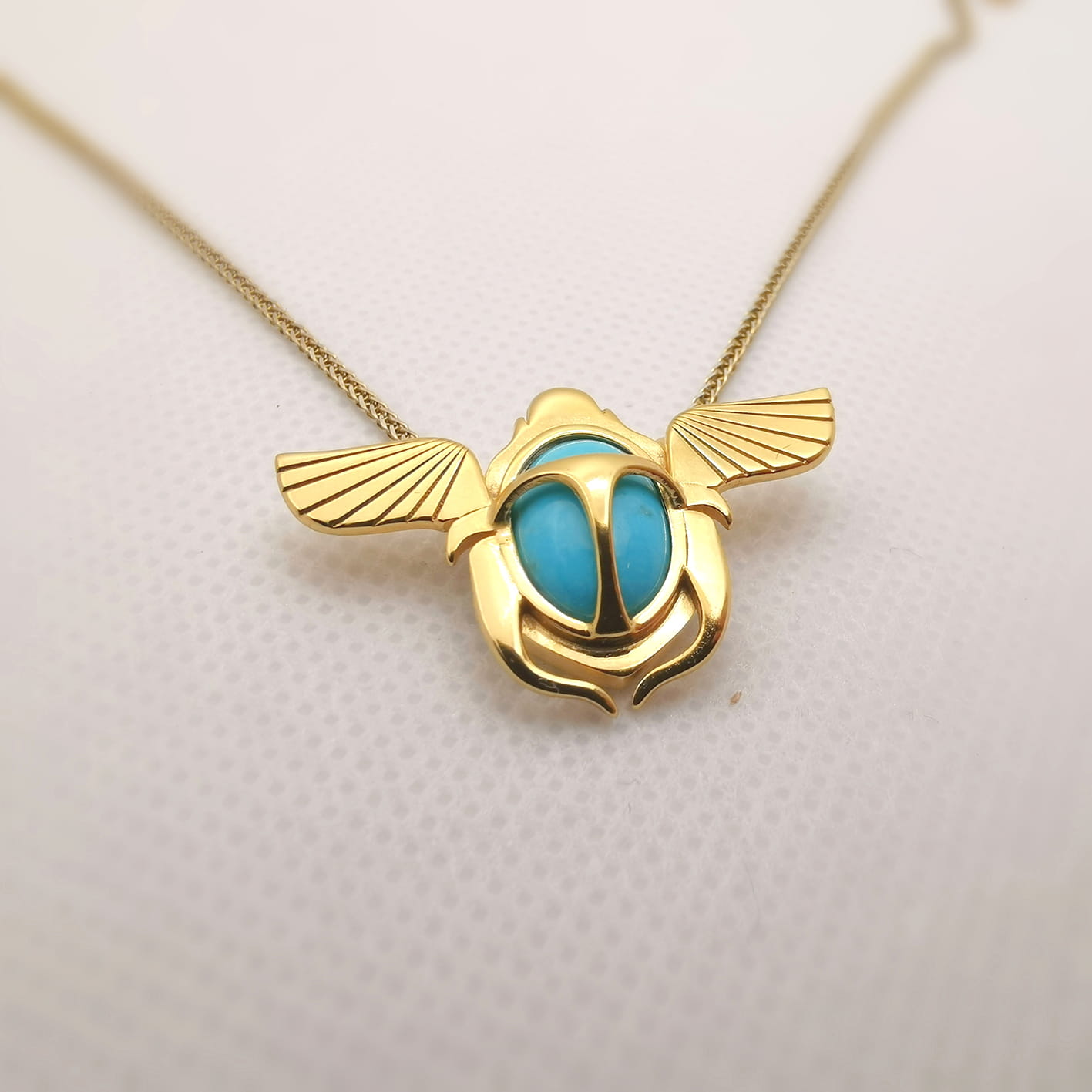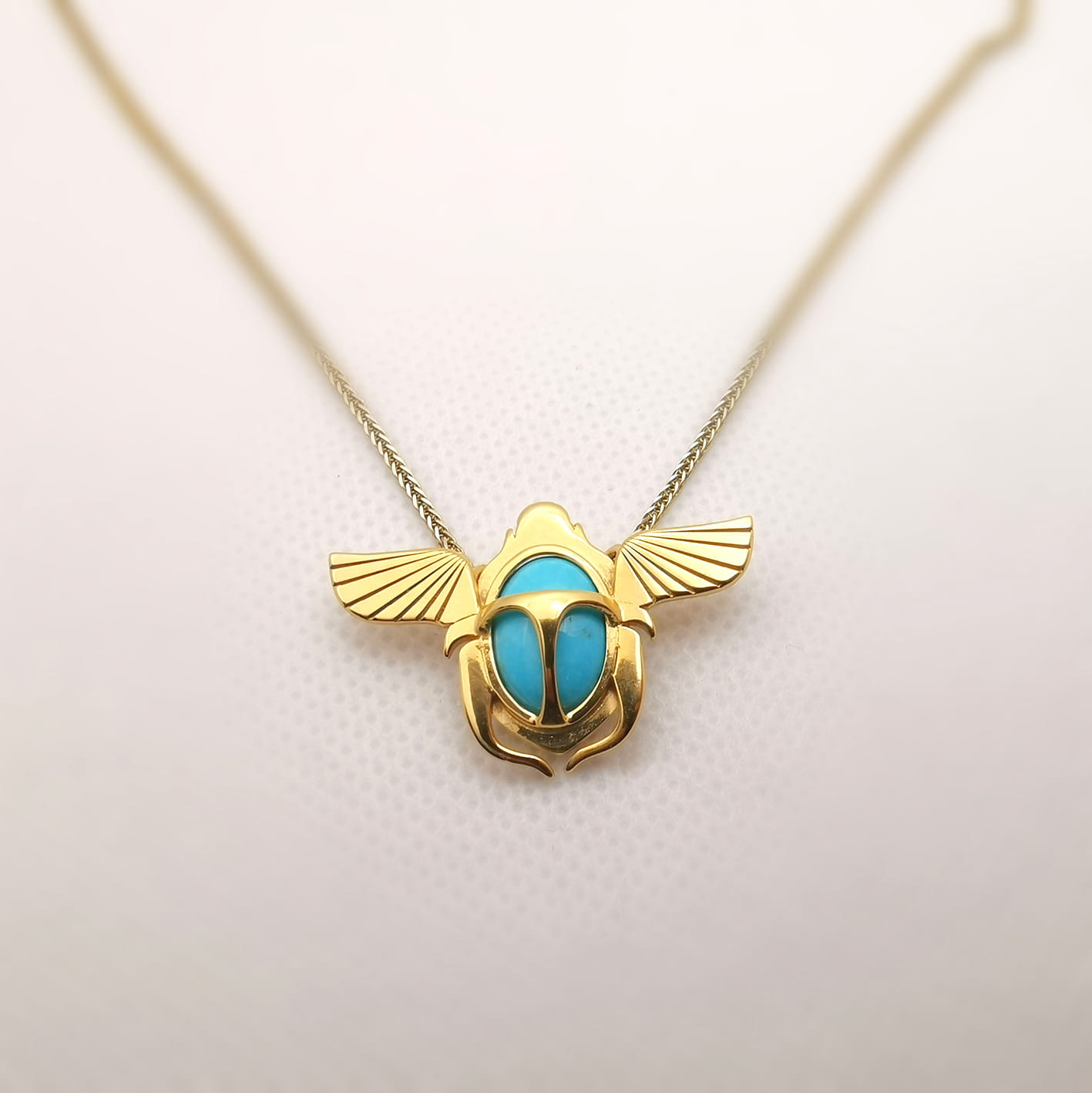 Unikatowy, wykonany ręcznie naszyjnik "Skarabeusz", ozdobiony 100% naturalnym turkusem około 11x9mm (przybliżony rozmiar - zależy od dostępności turkusów).