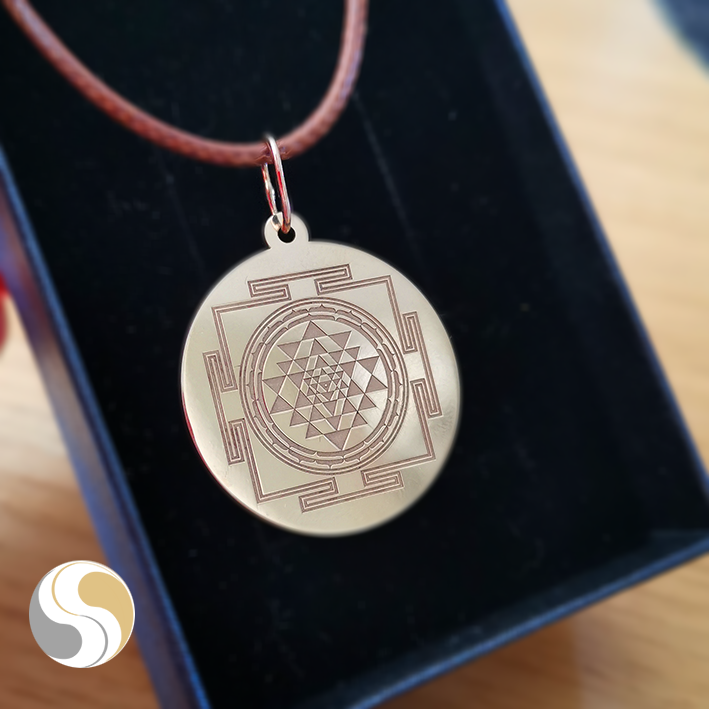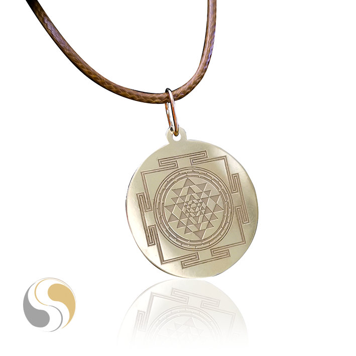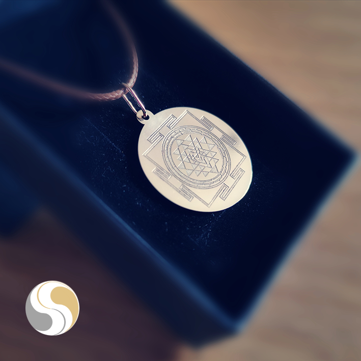 Shri Jantra wykonana w srebrze próby 925 pozłoconym czystym złotem o jasnej barwie. Dla zabezpieczenia powłoki złotej wisior został pokryty ekologicznym, niewidzialnym polimerem. Geometria/rysunek samego kształtu jantry jest precyzyjnie laserowo wygrawerowany. Blaszka jest wypolerowana. Jest to idealna i właściwa geometria shri yantry.