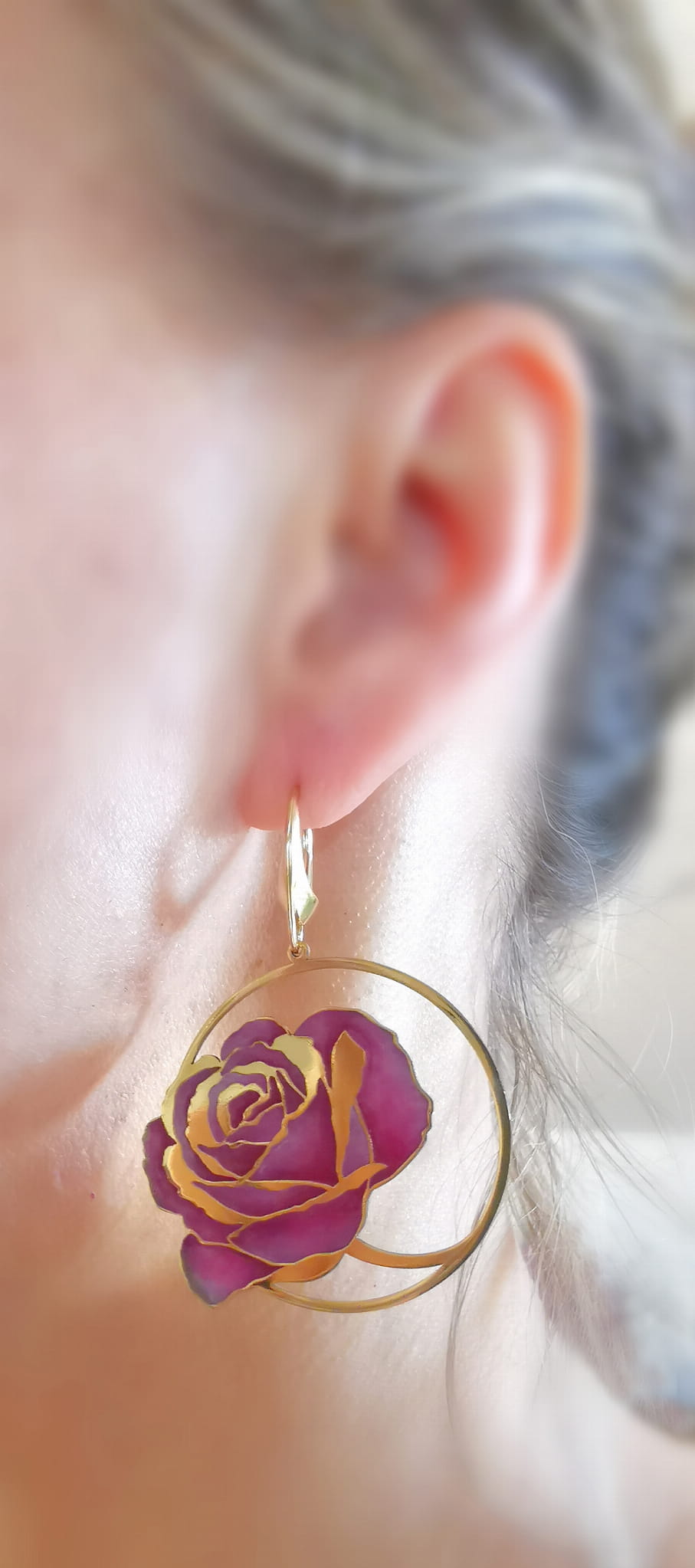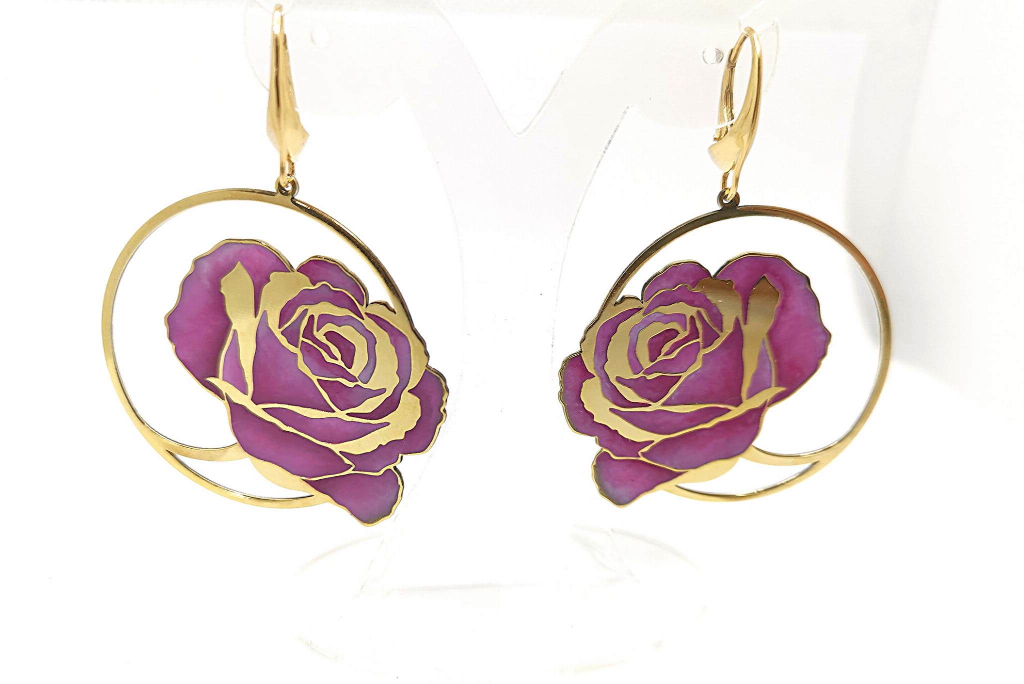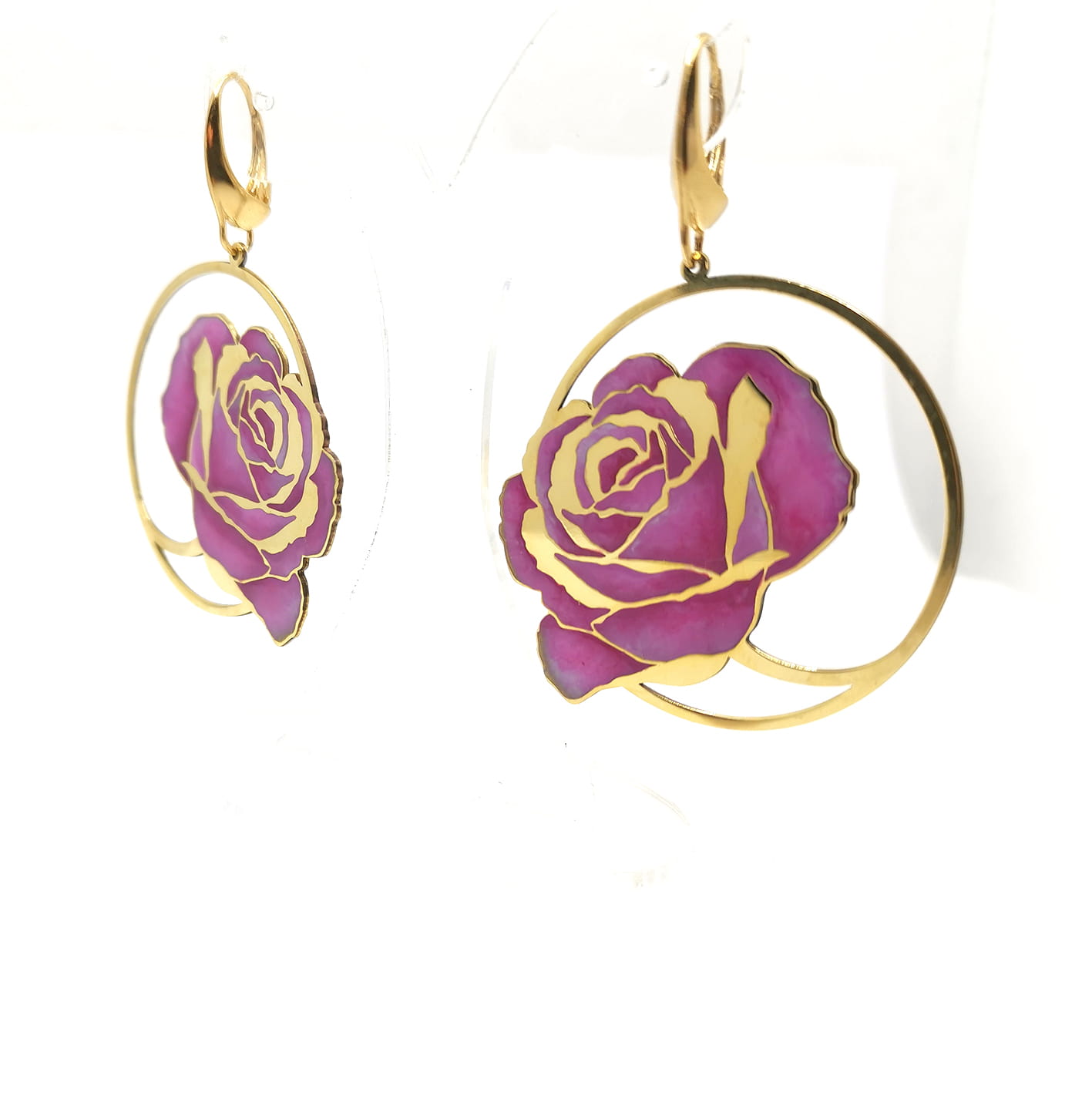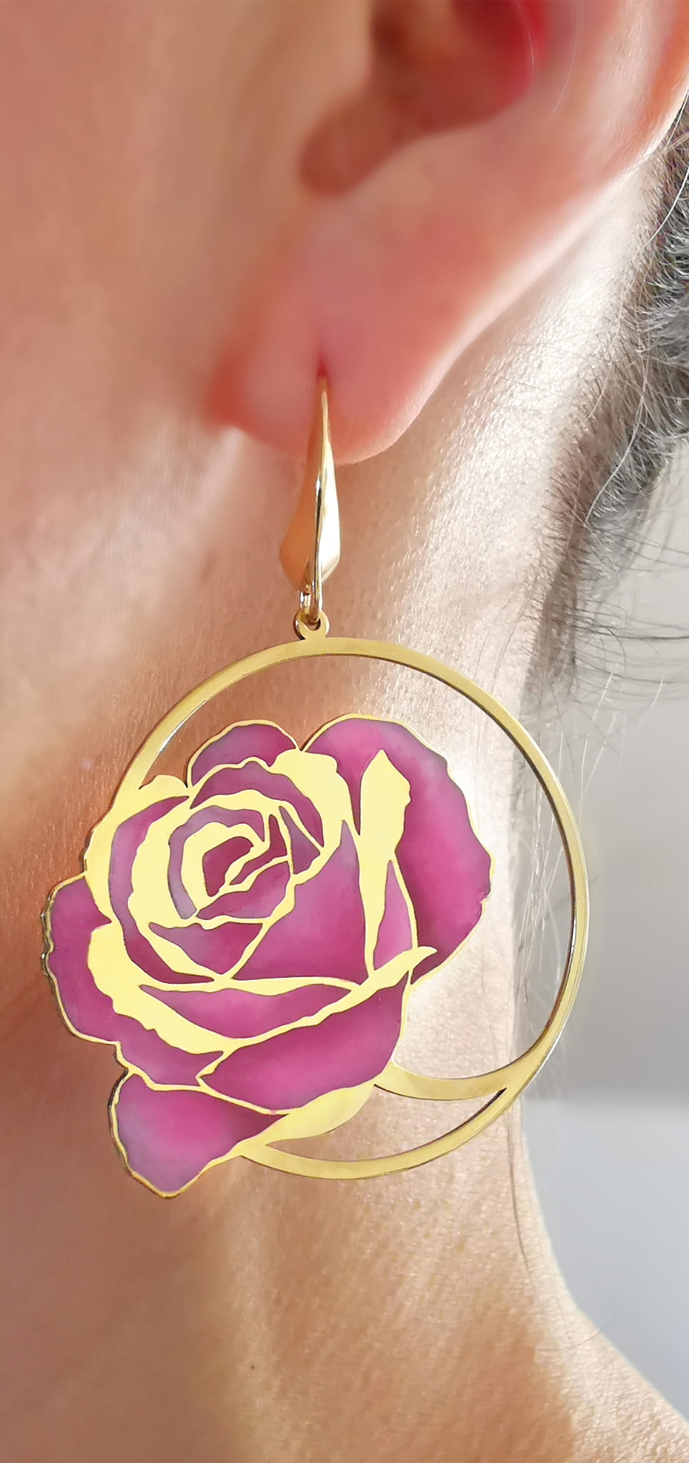 Kolczyki z różowymi różami w kołach, emalia, 45mm