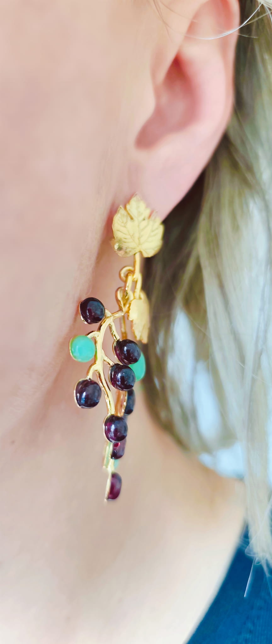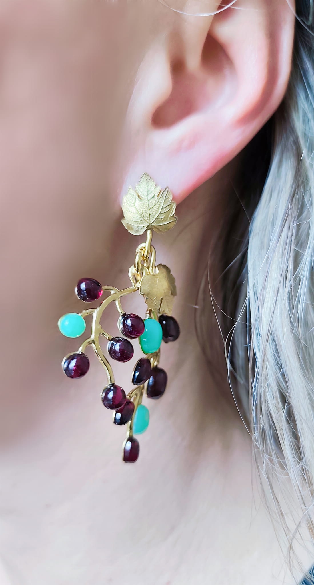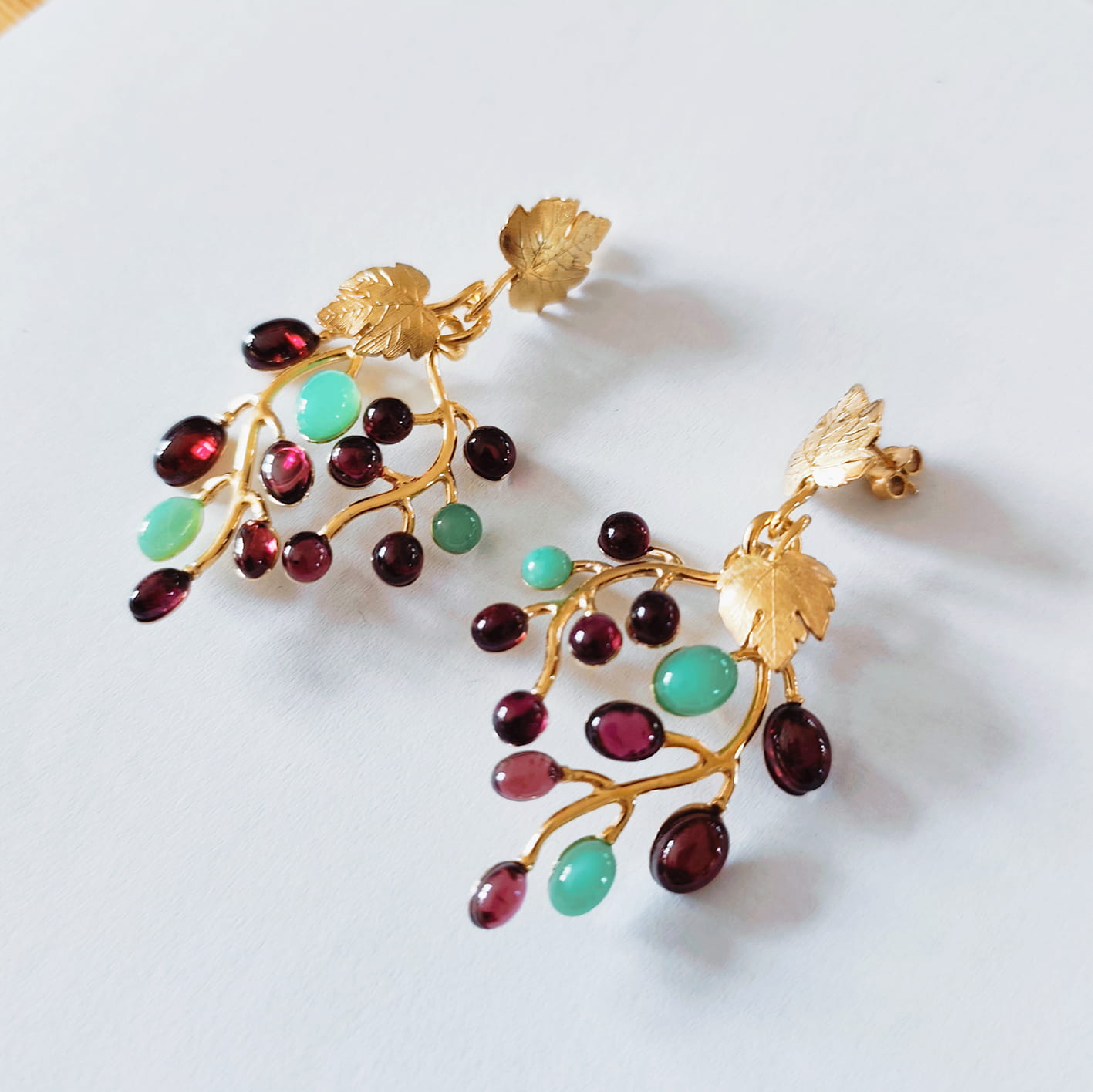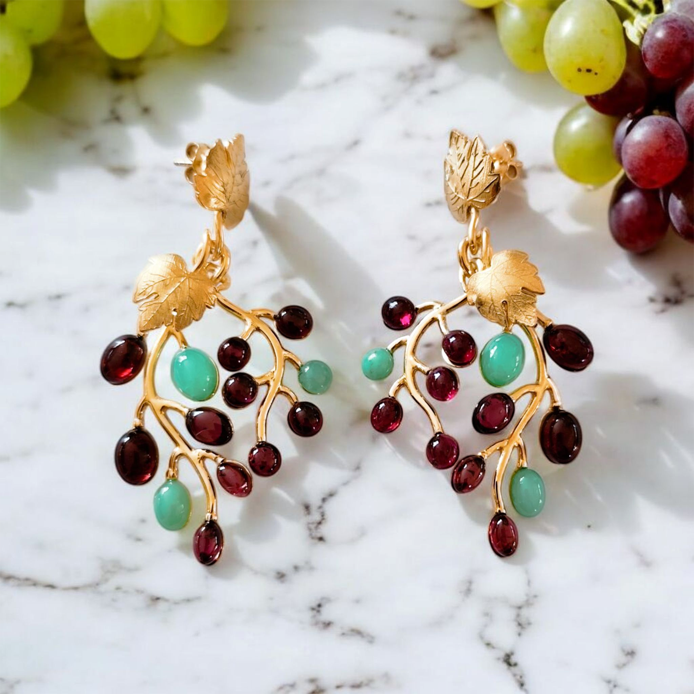 Fuzja dwóch rodzajów kamieni - granatów i chryzoprazów dała przepiękny efekt dopełniony listkami winogron. Kolczyki dyndają jak prawdziwe kiście winogron :)